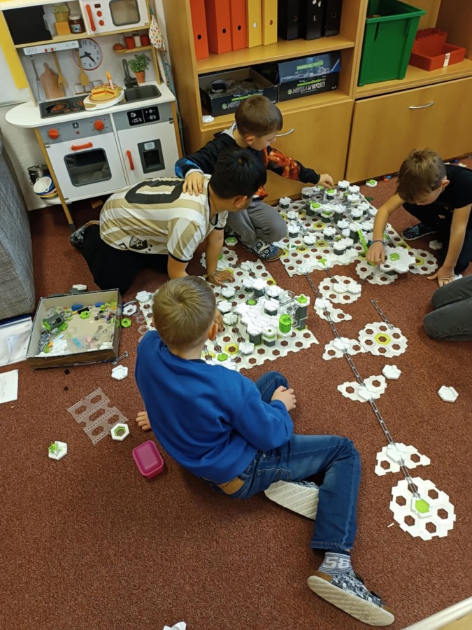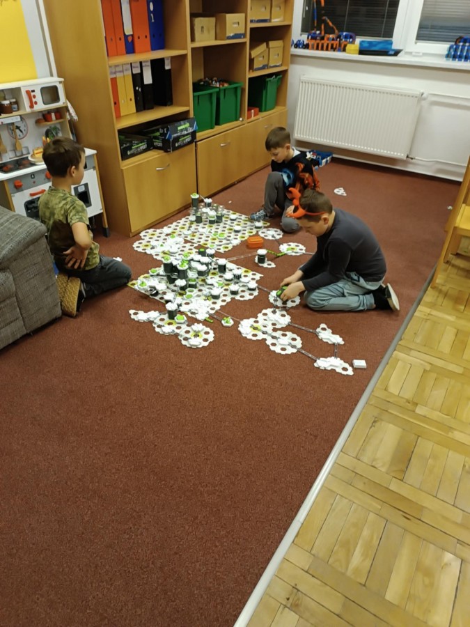 V adventním čase čekalo na děti v naší družince milé překvapení. Pod stromečkem jsme našli dárek od Ježíška – stavebnici GraviTrax, která děti okamžitě nadchla. Hned po rozbalení se pustily do stavění nejrůznějších drah pro kuličky a s velkým zaujetím zkoušely, jak fungují zatáčky, mosty i zrychlovače.