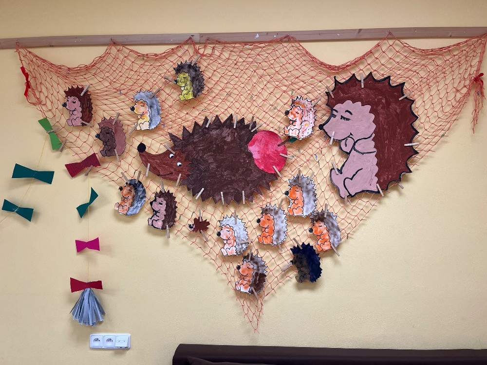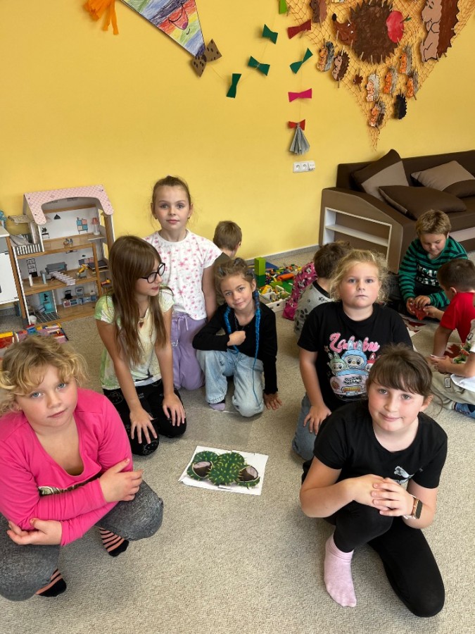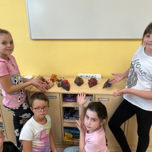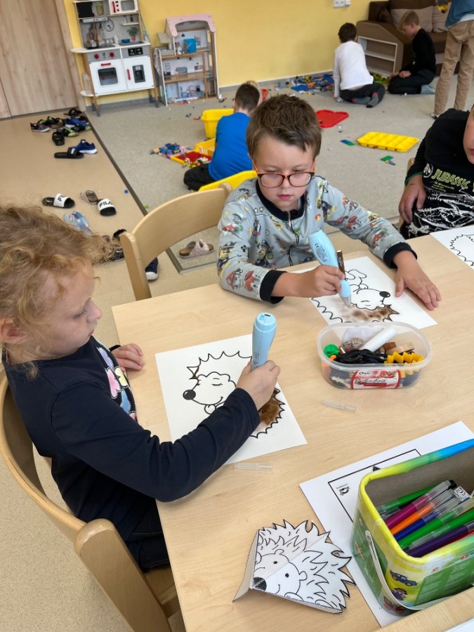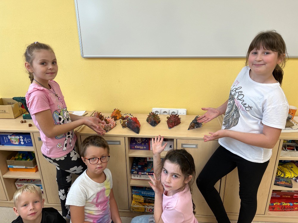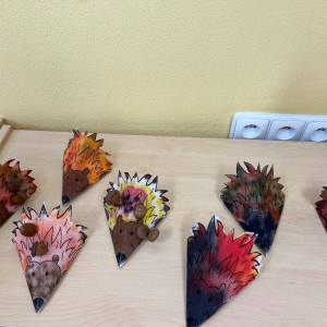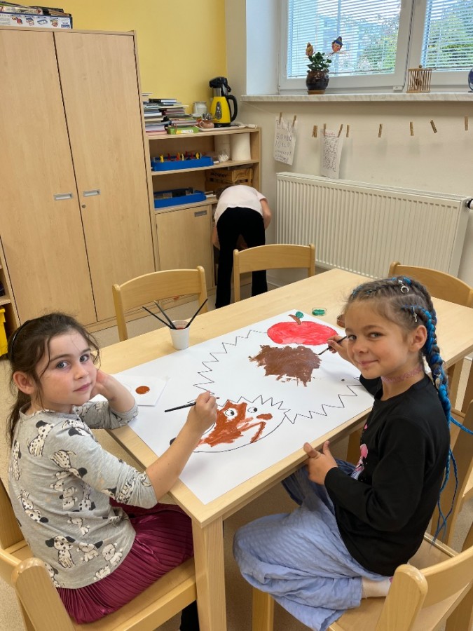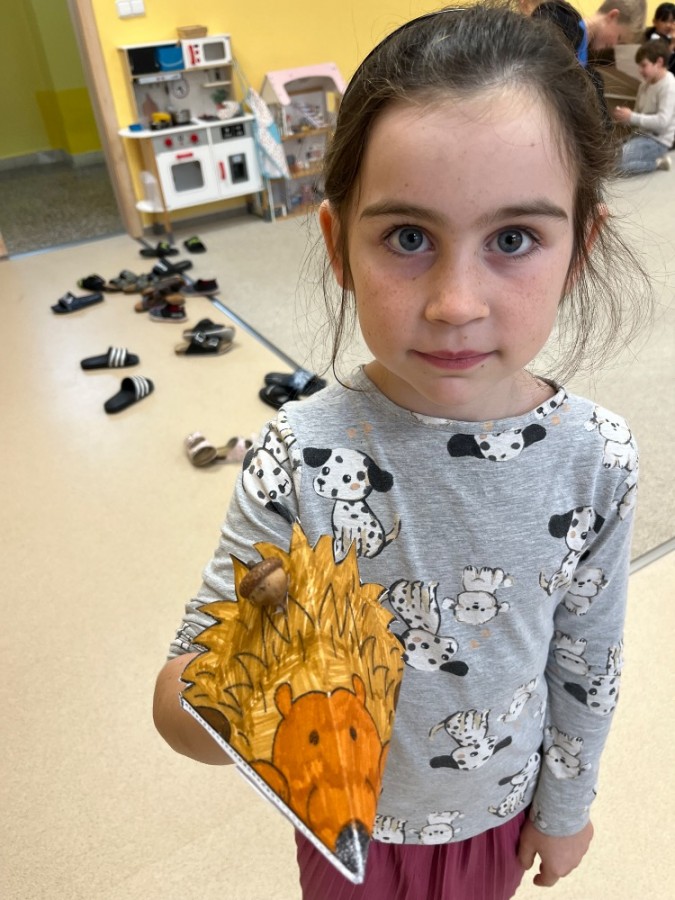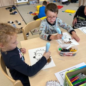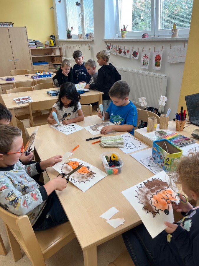 První říjnové týdny jsme se věnovali podzimu. Povídali jsme si o měnící se přírodě a jak se zvířátka chystají na zimu. Vyzdobili jsme si třídu v podzimním duchu - dráček Mráček a Ježčí rodinka. Děti měly možnost se zapojit do nabízených činností a vyrobit si ježečka na různé způsoby. Procvičovali jsme logiku a představivost při skládní puzzlí s podzimní tématikou. Na fotbalovém hřišti jsme uspořádali celodružinovou akci - Pouštění draků.