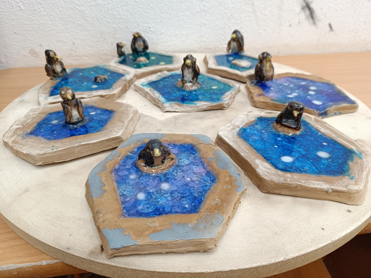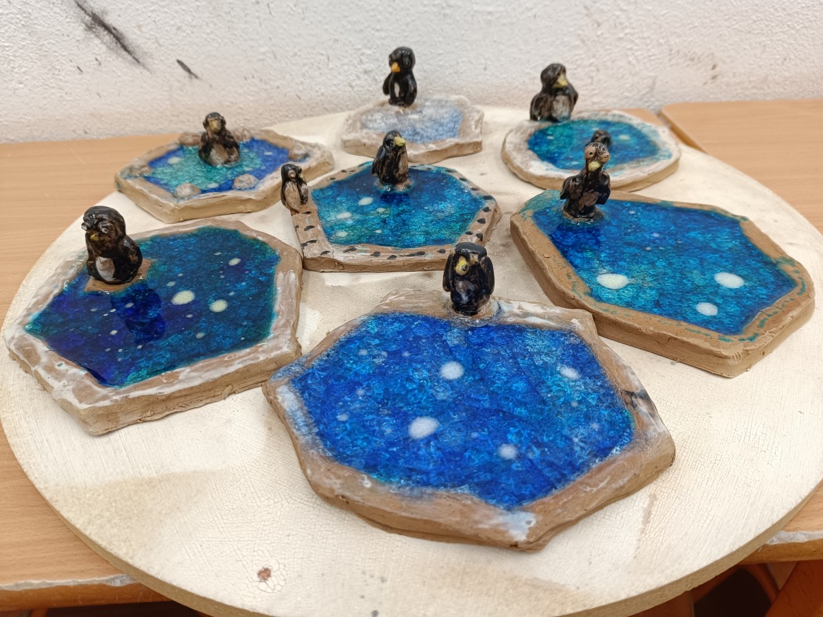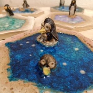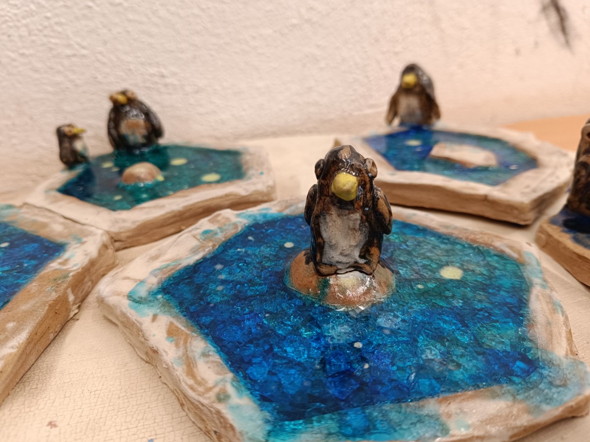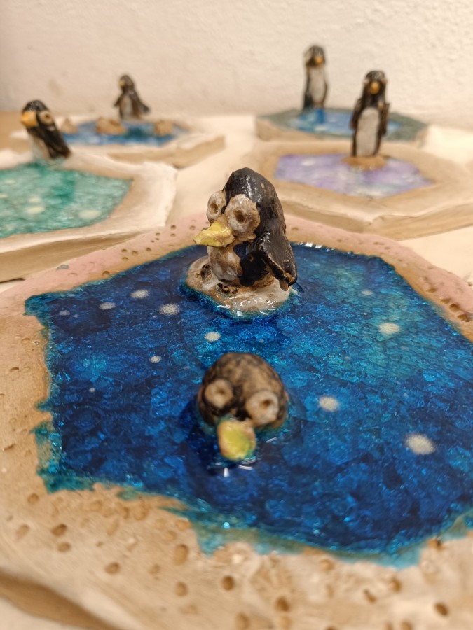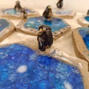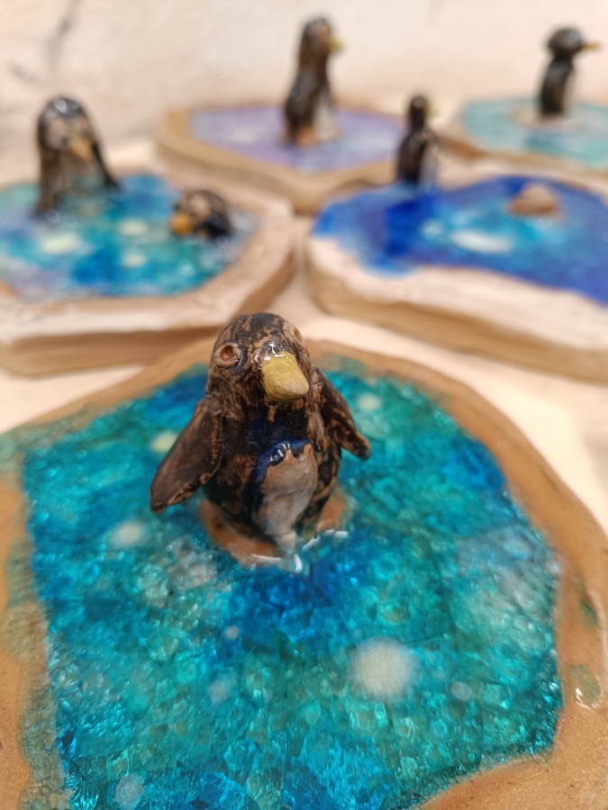 Tučňáci na ledu - engoba a sklo, páleno na jednožár.