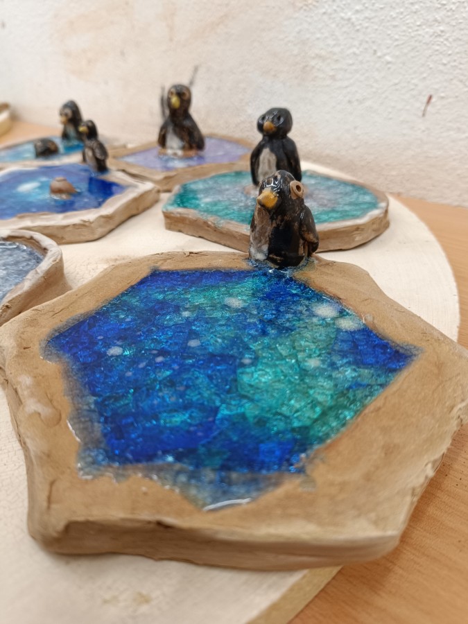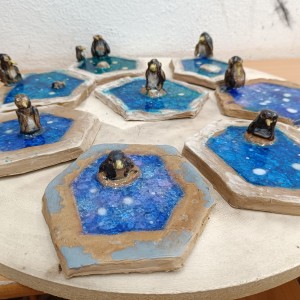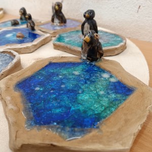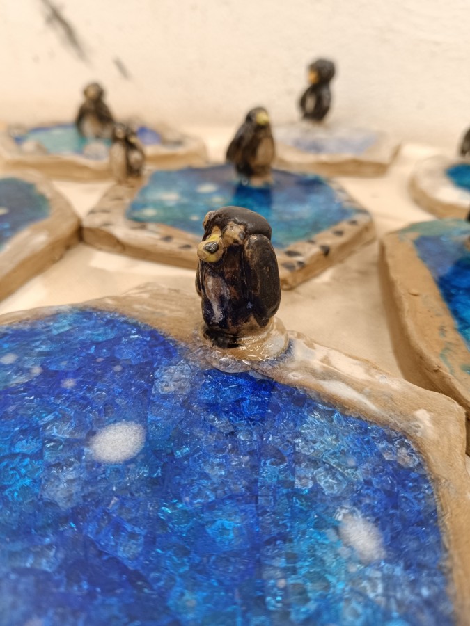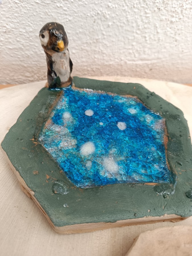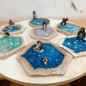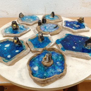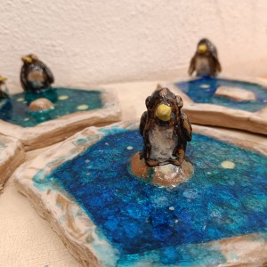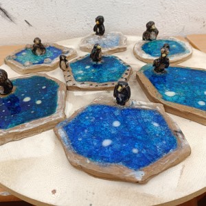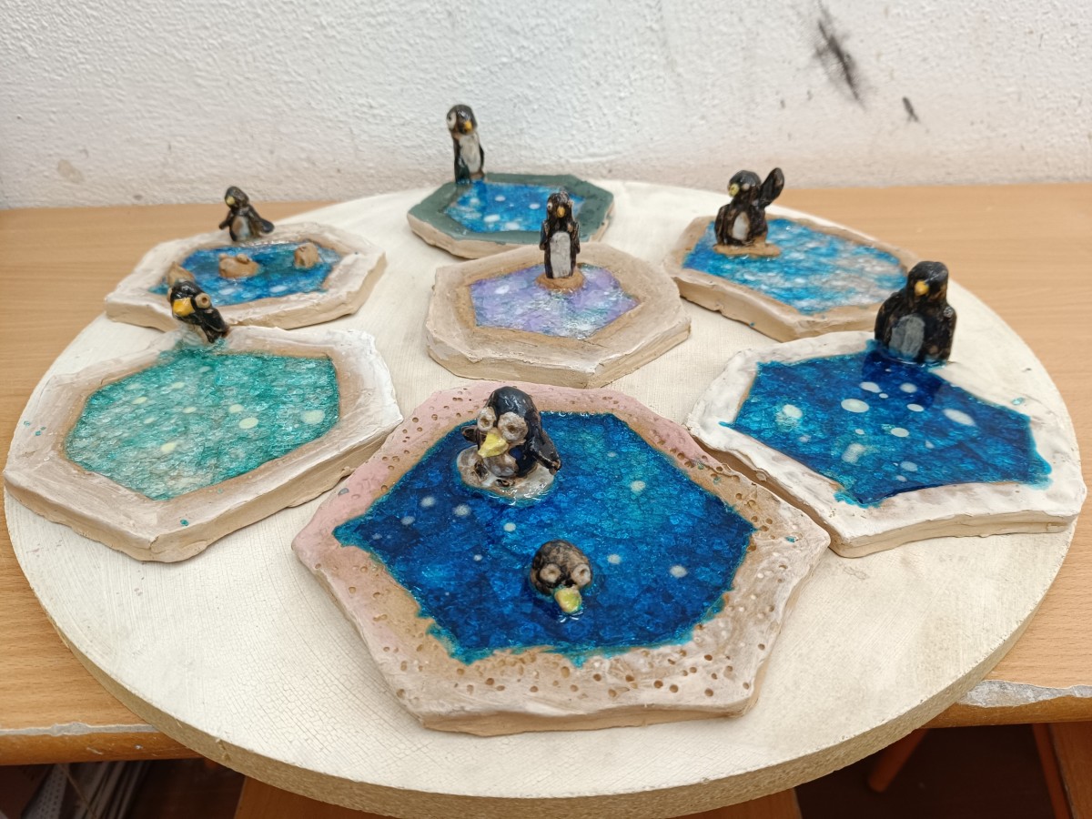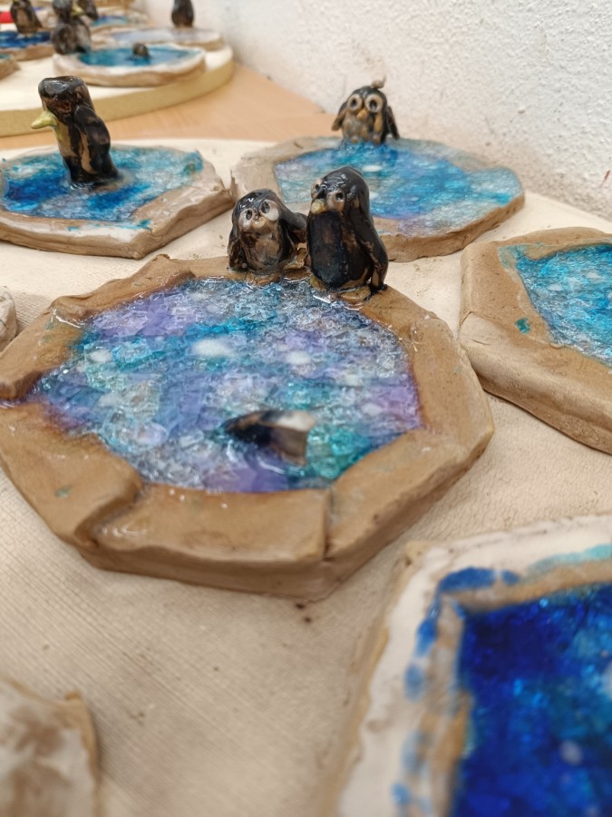 Tučňáci na ledu - engoba a sklo, páleno na jednožár.