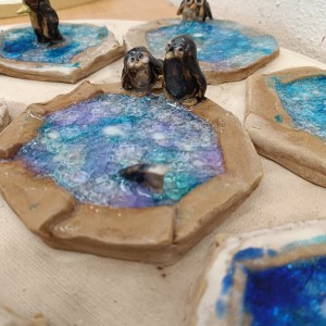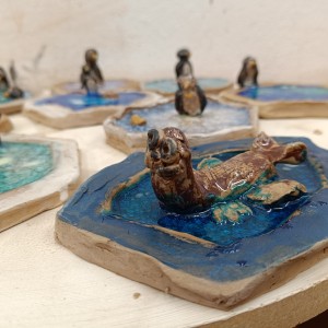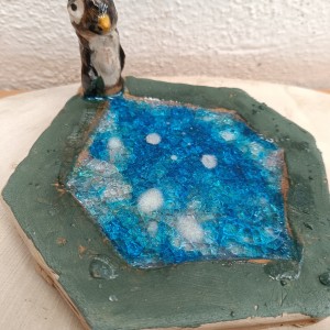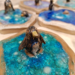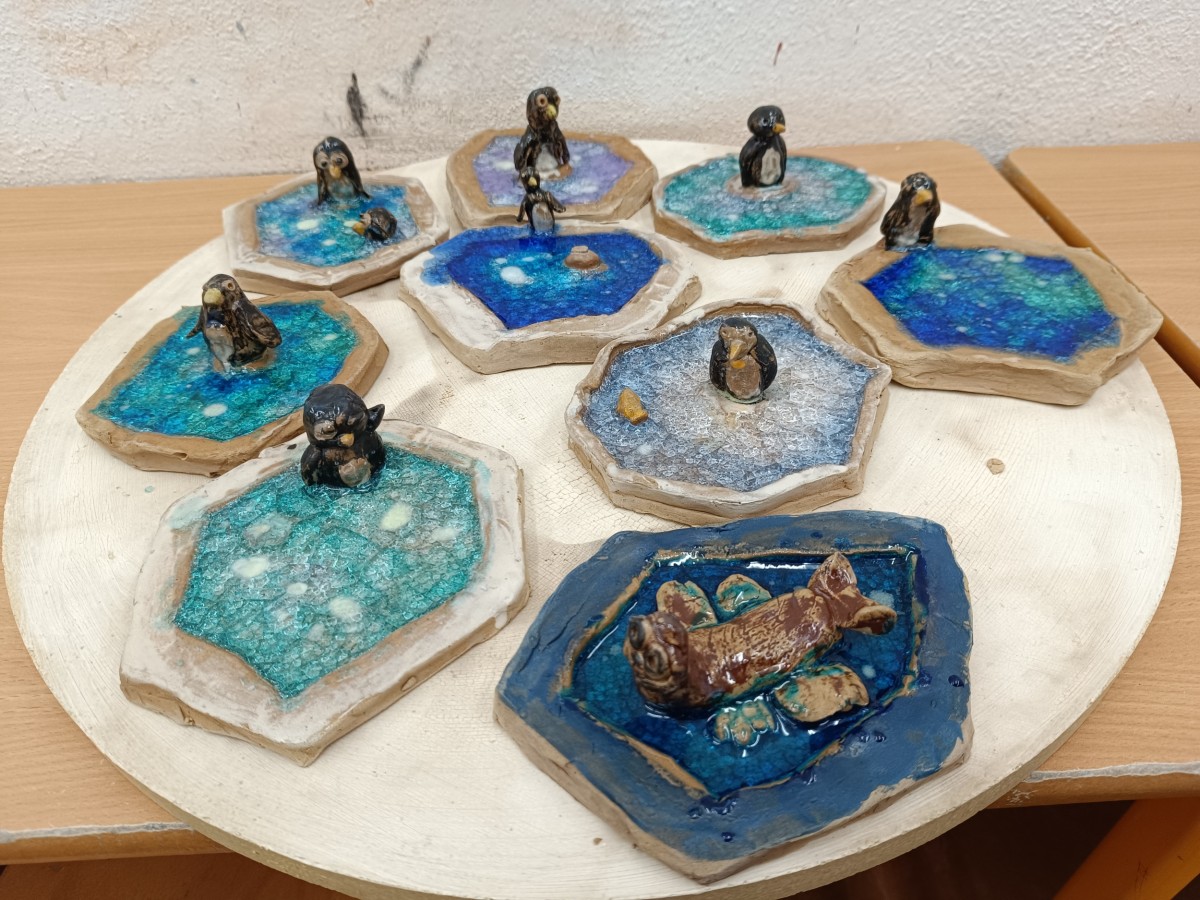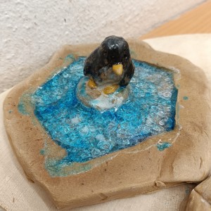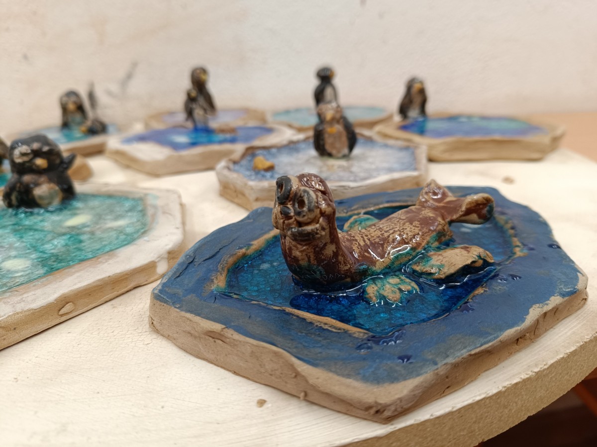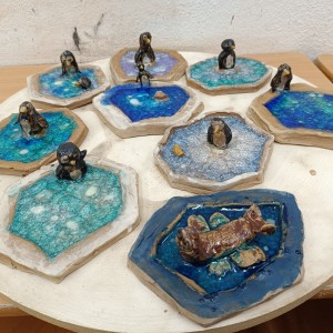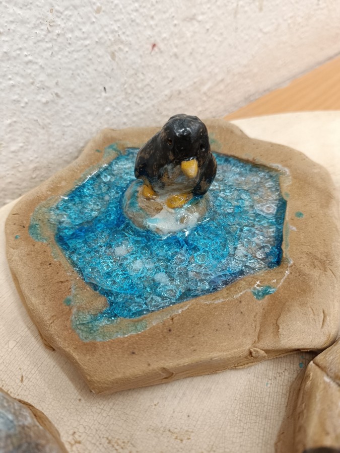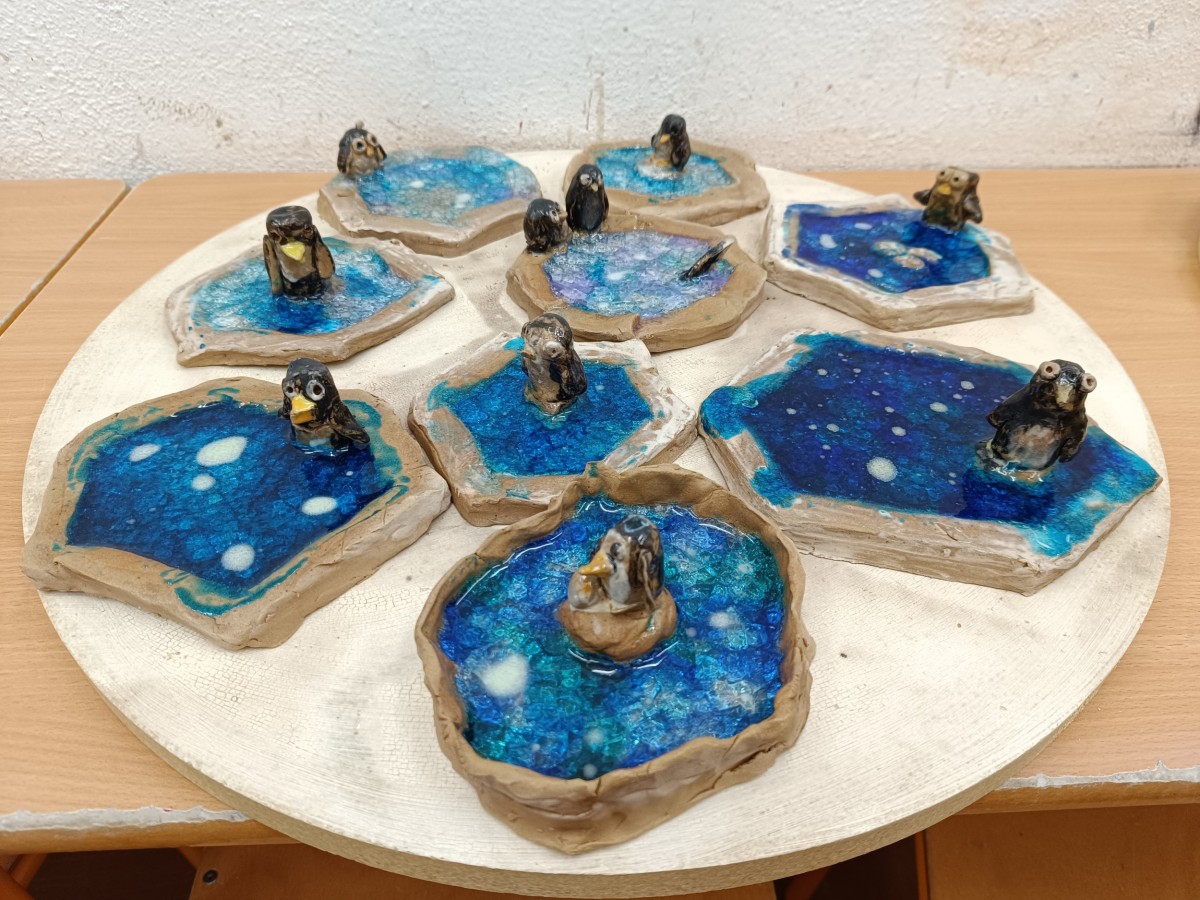Tučňáci na ledu - engoba a sklo, páleno na jednožár.