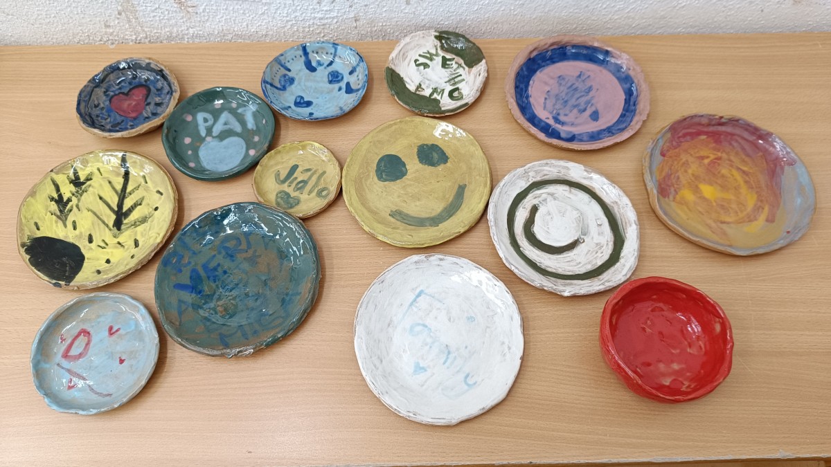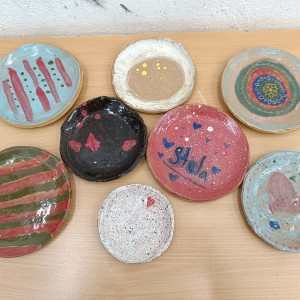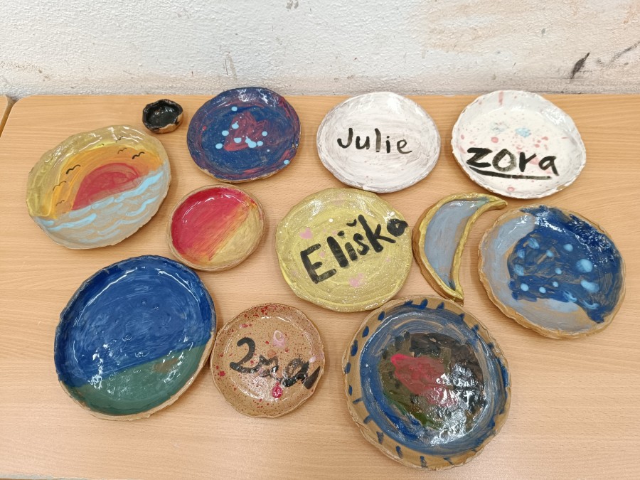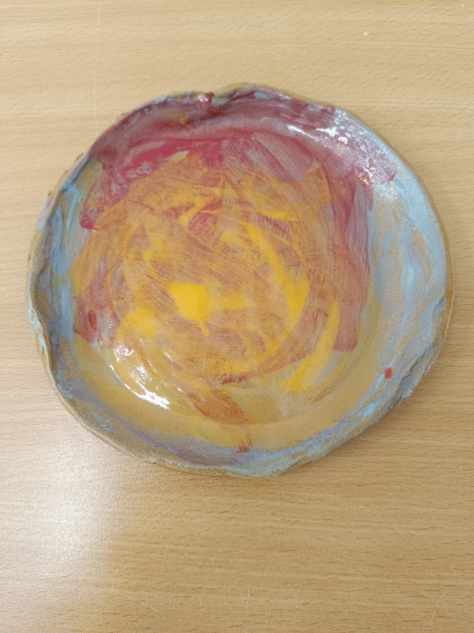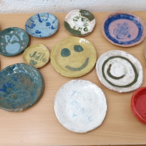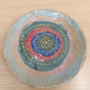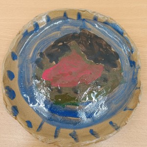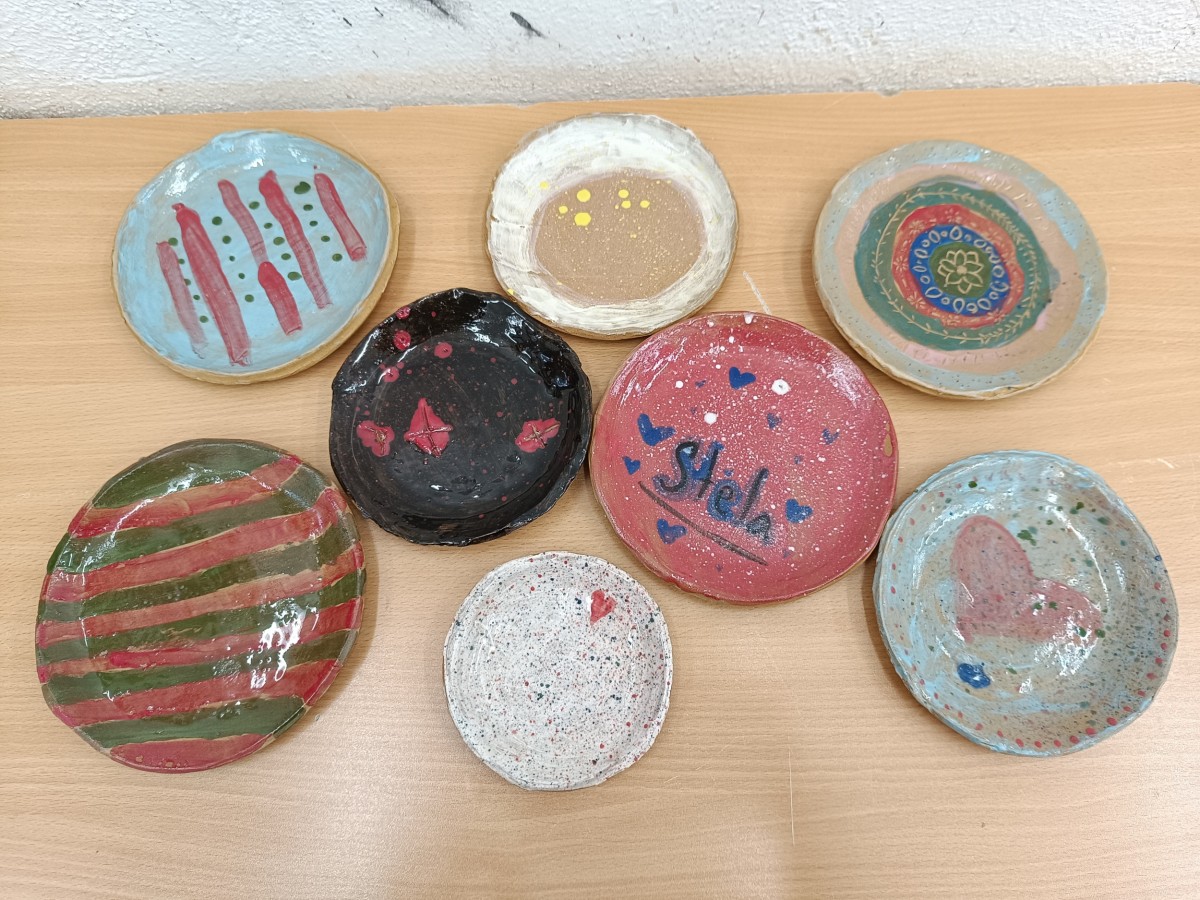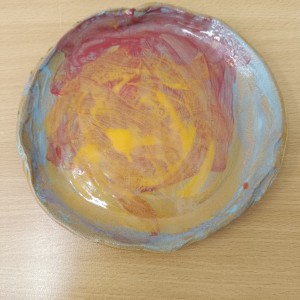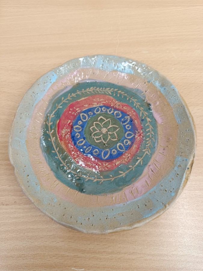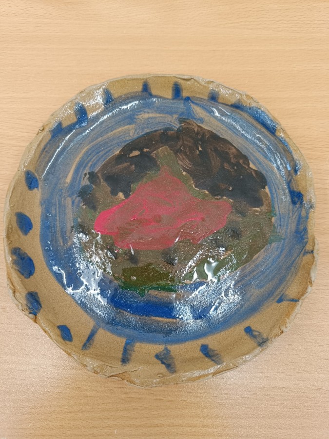 Talíře pomalované engobou, pálené s průhlednou glazurou.