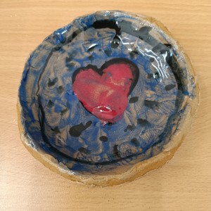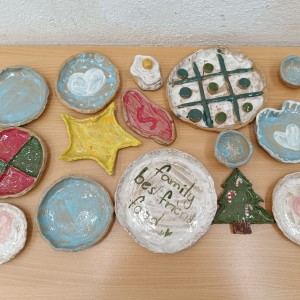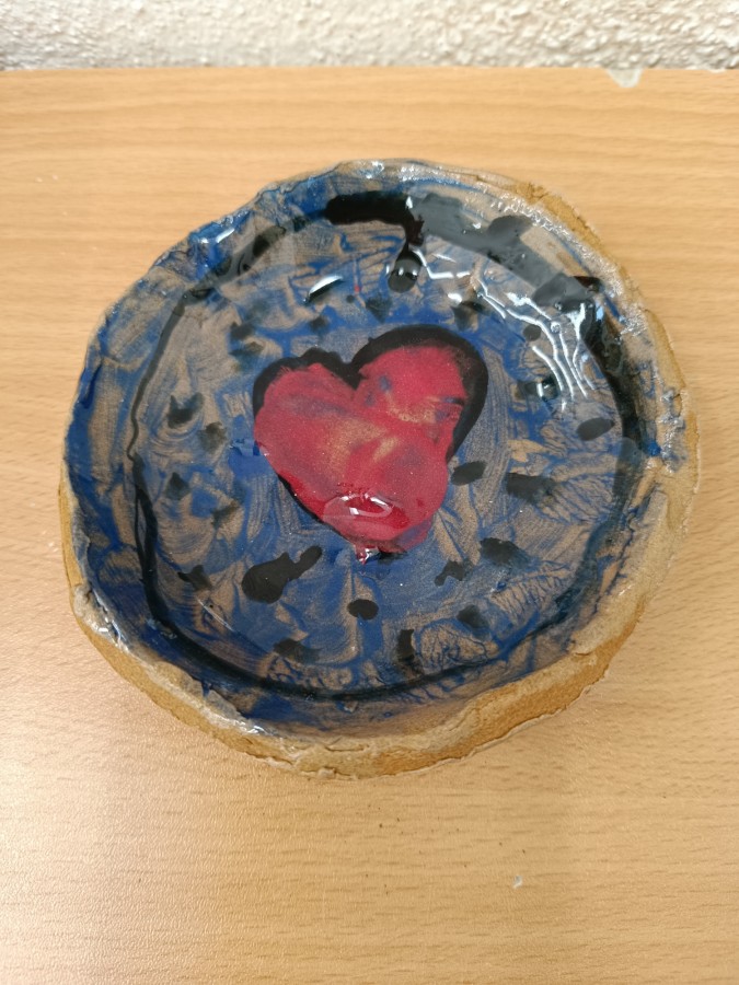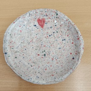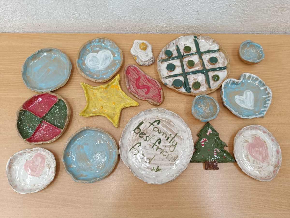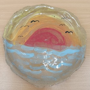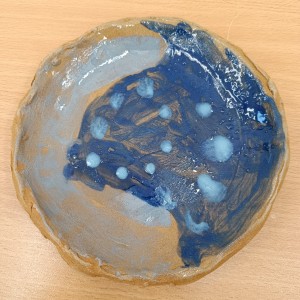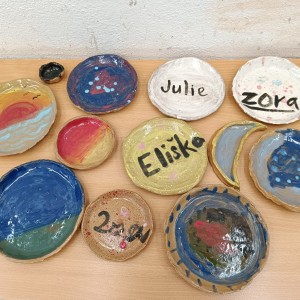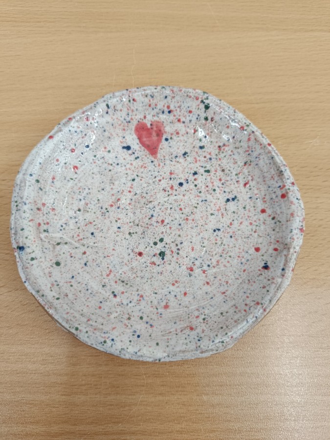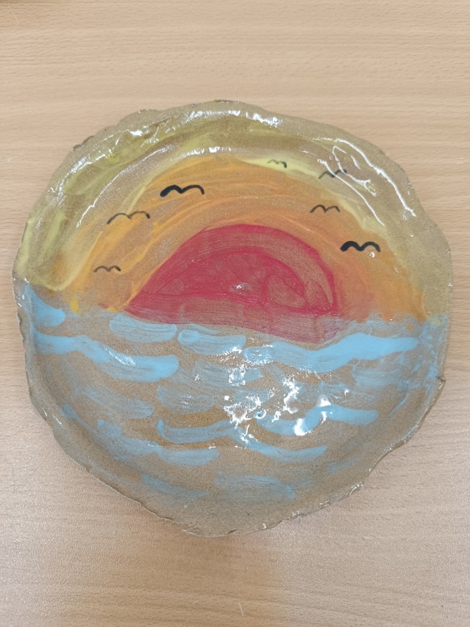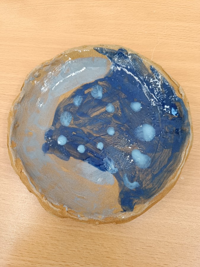 Talíře pomalované engobou, pálené s průhlednou glazurou.