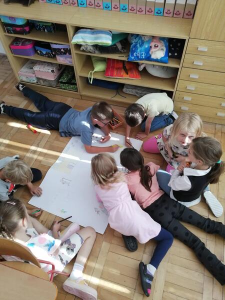 V rámci akce Pěšky do školy jsme se snažili dopravit do školy bez aut nebo aspoň kus cesty jít pěšky. Většina rodičů nám to umožnila, a tak jsme každý den mohli zapsat do aplikace naše výsledky. Také jsme si udělali vycházku s mapou do okolí školy. Hledali, pojmenovávali a zakreslovali jsme dopravní značky, o kterých jsme si pak v prvouce povídali. Ve výtvarné výchově jsme vytvořili plakát s našimi postavičkami při cestě do školy. Nyní nám zdobí naši chodbu.