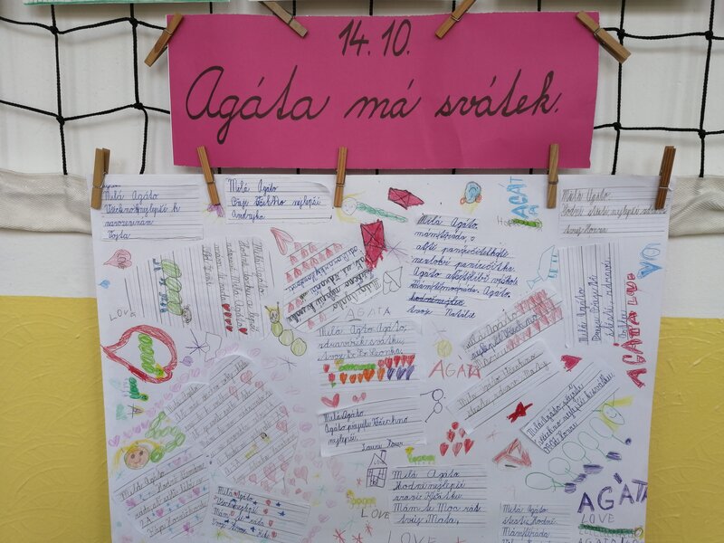 V úterý 14. října má svátek Agáta, náš třídní maskot, který nás provází už od první třídy. Agátě jsme nejenom popřáli, ale i napsali přáníčka.