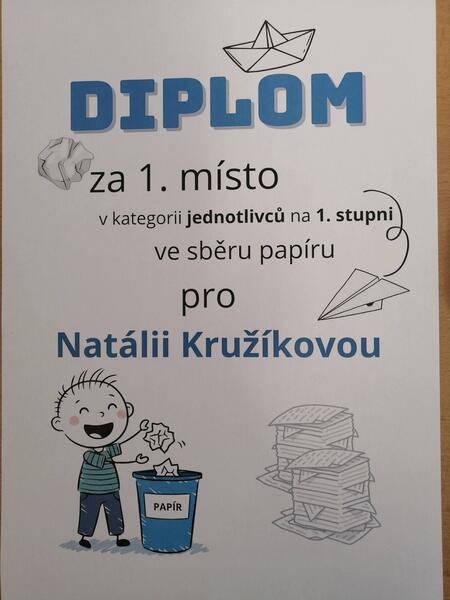 Ve sběru papíru, v kategorii jednotlivci - 1. stupeň, se naše Natálka Kružková dostala na bezvadné 1. místo. Gratulujeme.