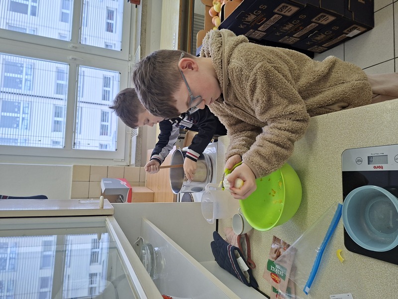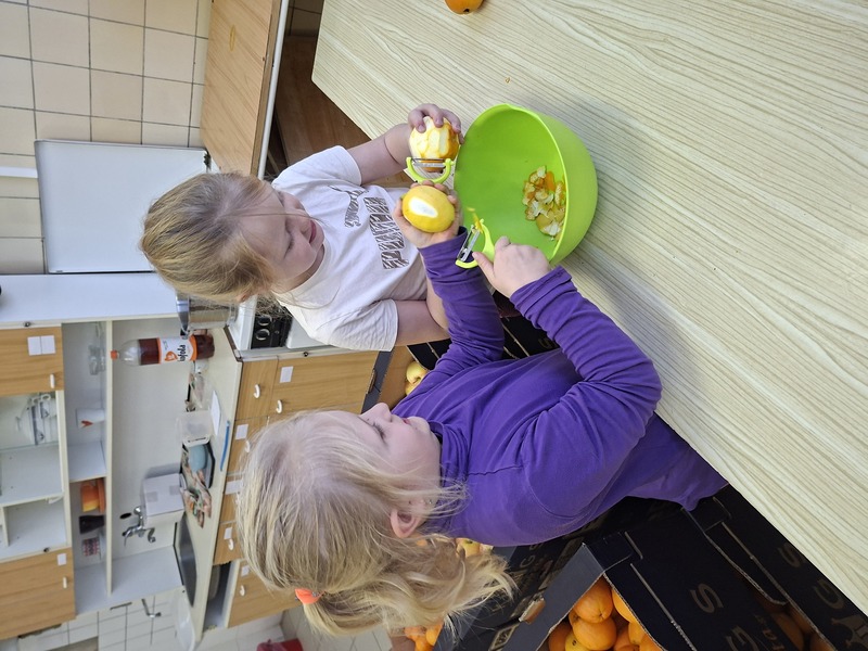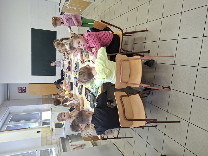 Na vánoční jarmark jsme se chystali už dlouho dopředu. Všechno začalo sušením šípků na topení ve třídě. Děti si je společně s rodiči natrhaly a ve třídě pak bedlivě hlídaly, jestli už jsou dost suché. Další výrobek, který jsme vytvářeli byl malý vánoční stromeček na prodej a abstraktní kresba stromu na výzdobu. Ve volnějším čase jsme chystali skládané a stříhané vločky a hvězdičky do oken a chodeb a stromky do oken třídy. Pro šípky si každý nachystal pomalovaný sáček s mašličkou. A poprvé jsme navštívili školní kuchyňku, kde jsme vařili vánoční sirup. Jak se nechala slyšet jedna holčička: "Jako bychom míchali nějaký lektvar!" :-D Po vylouhování koření jsme sirup slilli do skleniček a tyto ozdobili.