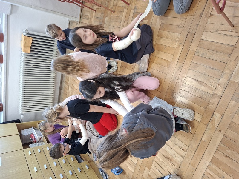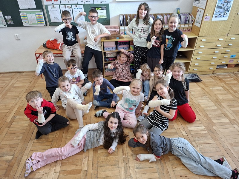 V prvouce se nyní věnuje lidskému tělu, a tak jsme si procvičili obvazování různých částí těla. Ještěže fotí jen paní učitelka - skončila jako mumie. :-D