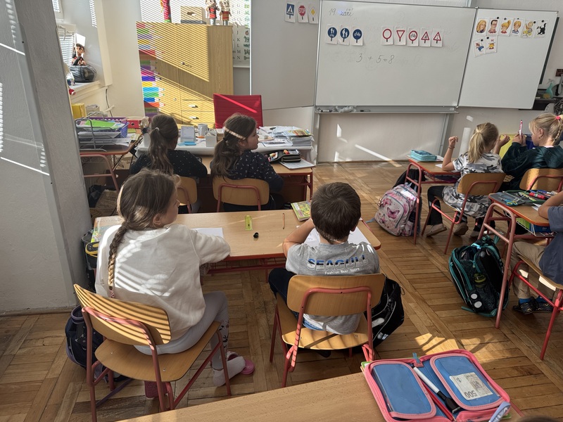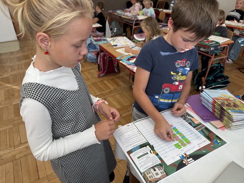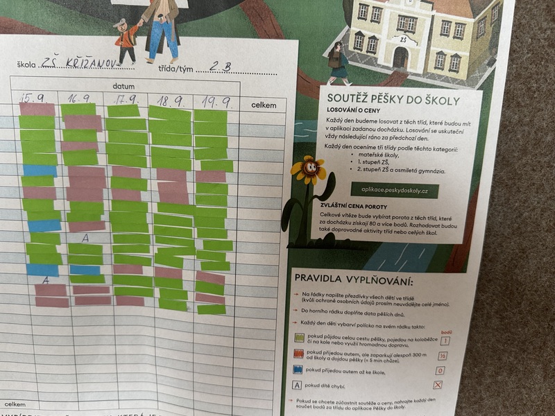I my jsme se zapojili do akce Pěšky do školy, která se konala od 15. do 19. září. Dařilo se nám skvěle! Do školy jsme chodili pěšky, jezdili na kole i koloběžce. Každý den jsme zapisovali naše výsledky. Dokonce celé tři dny jsme každý šli alespoň kousek do školy pěšky. Cestou jsme pozorovali dopravní značky, které jsme pak počítali v matematice, řadili jejich názvy podle abecedy a kreslili cestu do školy. V prvouce jsme si povídali o bezpečnosti a šli na vycházku vyzkoušet naše znalosti v silničním provozu.