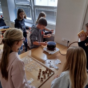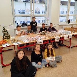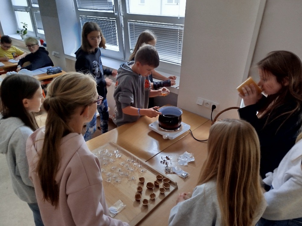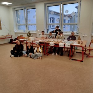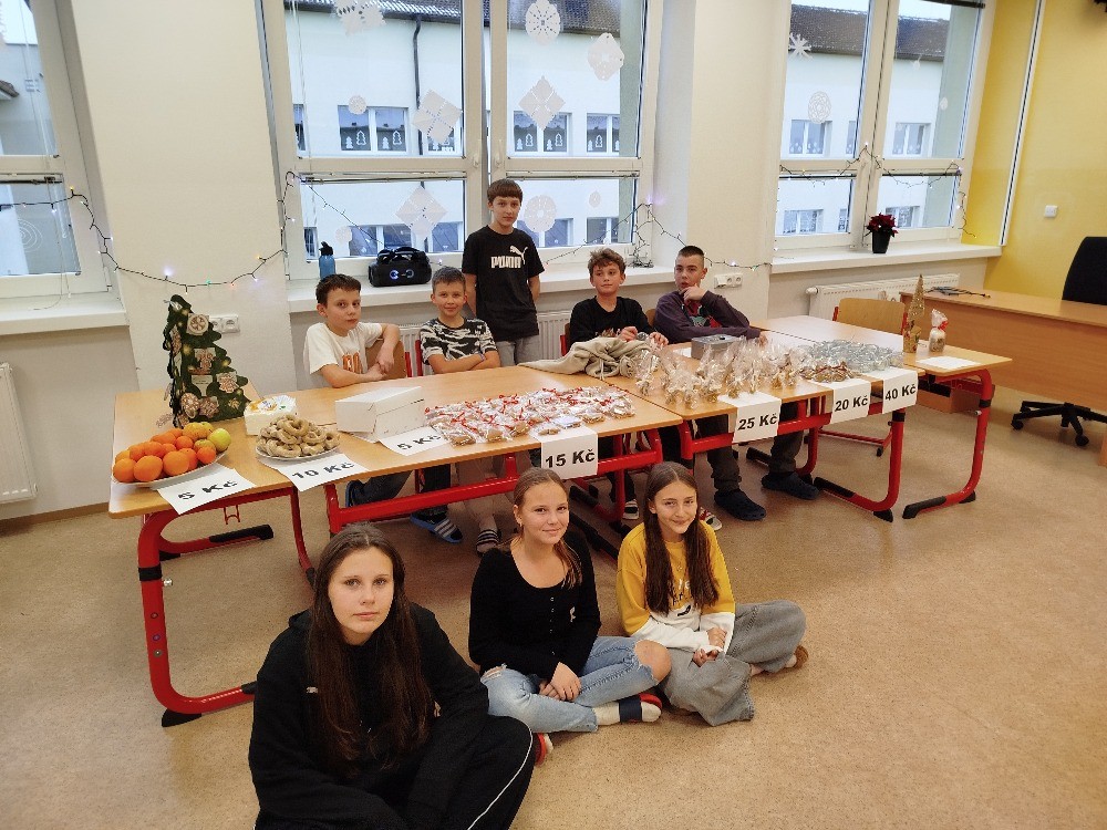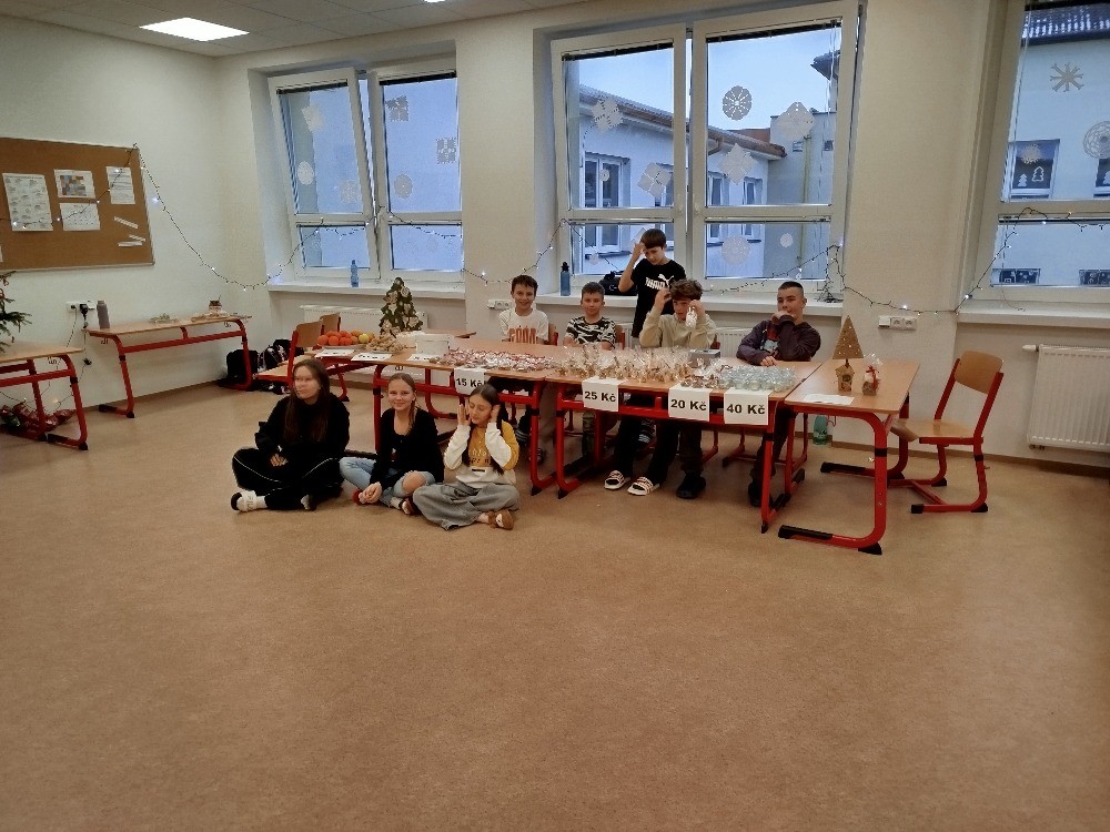 Během listopadu jsme si připravovali s vyučujícími výrobky, které jsme na jarmarku prodávali. V našem stánku jsme prodávali čajové svíčky z včelího vosku, svícínky z leptaného skla, svíčky ze skořápek ořechů na pouštění lodiček a také vlastnoručně pečené perníčky.