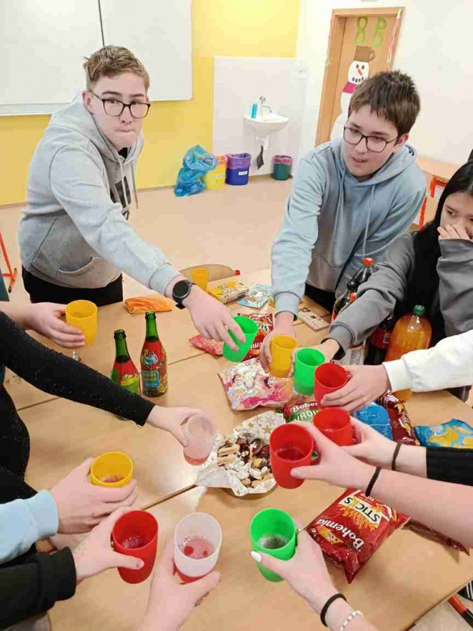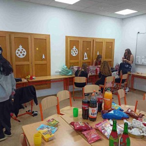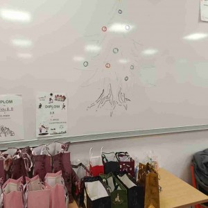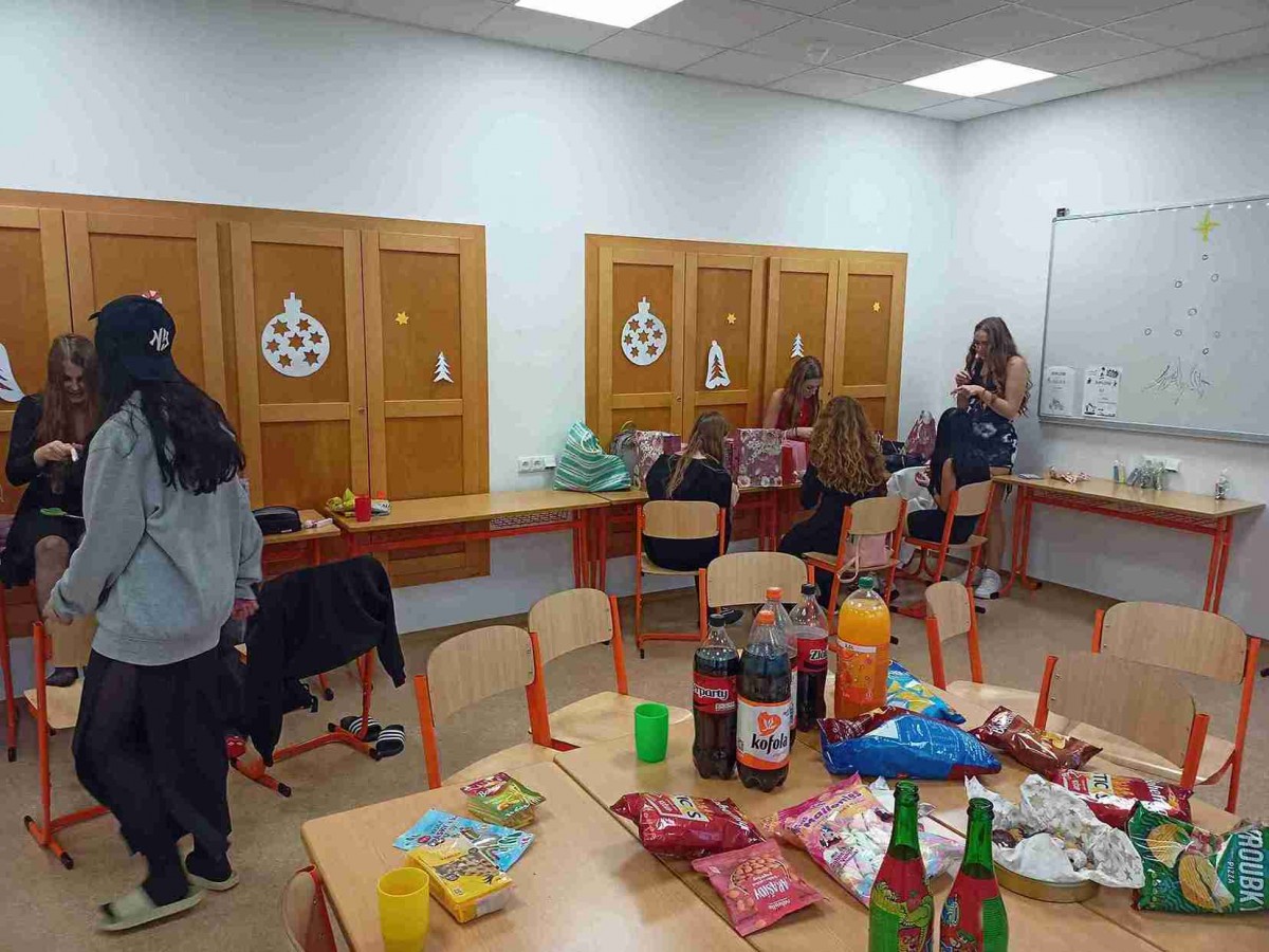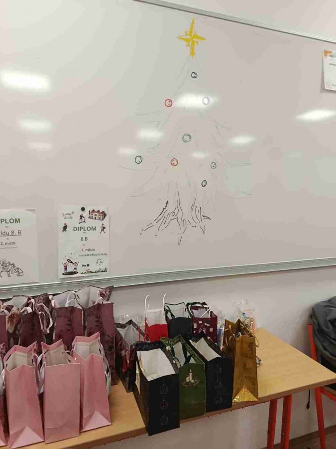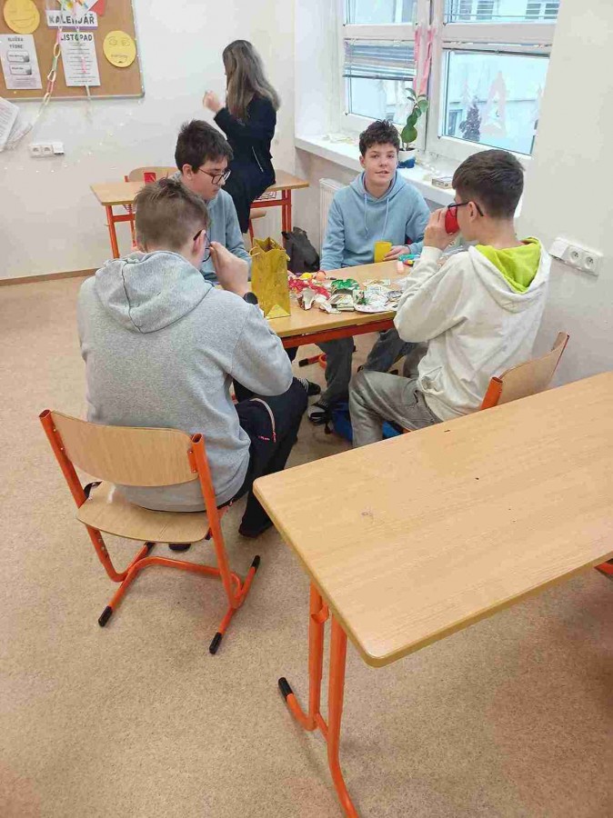 V předvánočním čase jsme ve škole slavili Vánoce. Sice jsme se první dvě hodiny učili, ale po velké přestávce jsme už byli ve třídě, kde jsme měli cukroví, limonády, brambůrky a další dobroty. Rozdali jsme si mezi sebou dárky, povídali jsme si a dívali jsme se na film, který jsme měli rozkoukaný. Bylo to fajn a těšili jsme se na prázdniny.